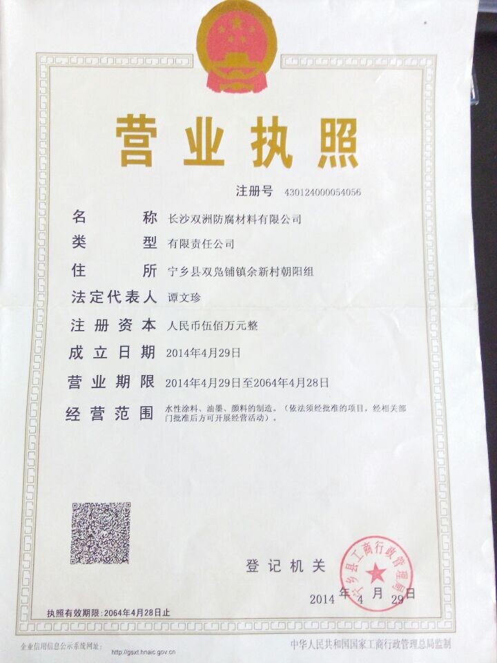 长沙双洲防腐材料有限公司成立于2014年4月29日(前身为创立于1998年的长沙双洲涂料化工厂),是一家专注于防腐涂料研发、生产与销售的高新技术型企业,位于湖南省长沙市宁乡市双凫铺镇余新村朝阳组。公司注册资本1200万元人民币,是中国防腐涂料行业的骨干企业,公司拥有宁乡玉潭工业园和双凫铺工业园两大生产基地,占地86亩,预计产能达2亿元,具备完善的涂料研发、生产、物流、销售及质保体系,公司主要装备从德国、意大利等国引进,年生产能力 达2 万吨,能生产国际标准的 14 大类、一千多个花色品种,广泛用于工业、建筑、特种涂装领域。“双洲牌”重防腐漆 一直为消费者**的品牌,并被多家铁建、石化、电力、钢铁、水泥公司指定为战略合作品牌。